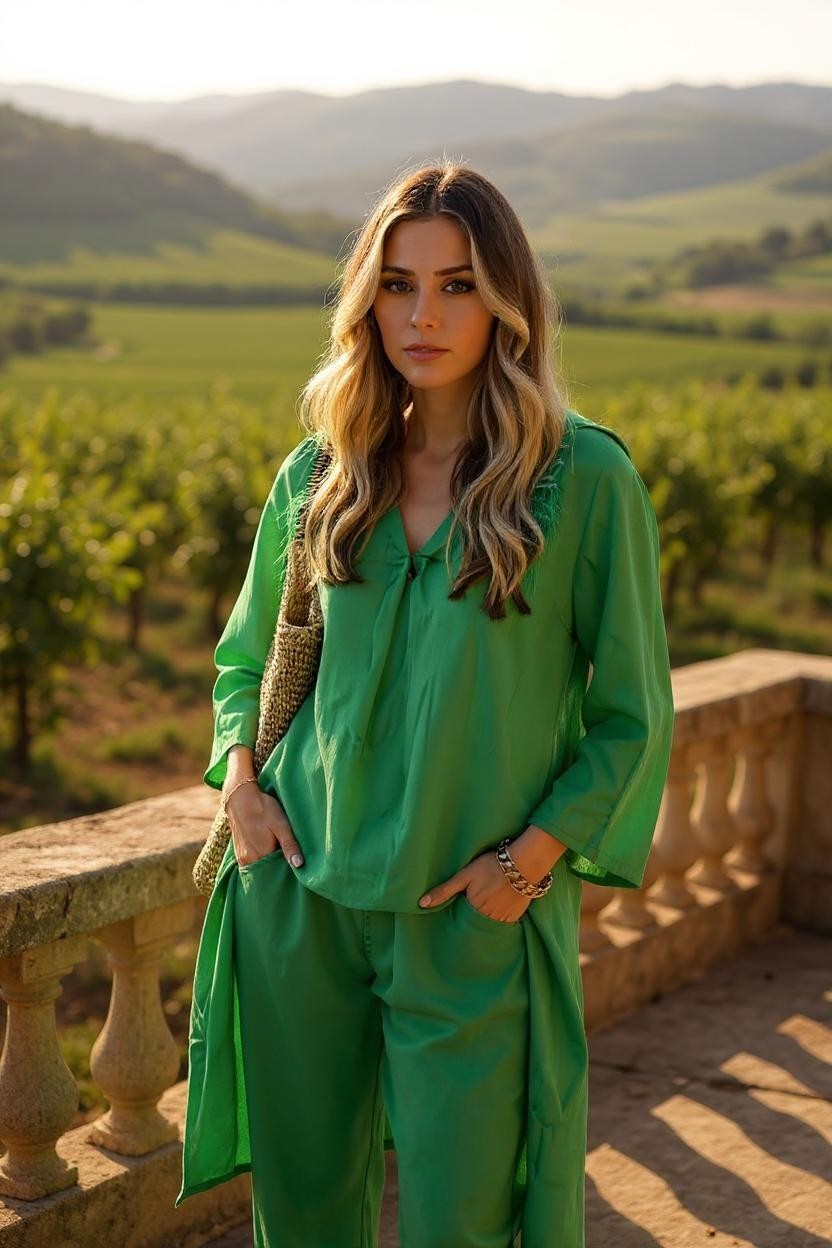 Norena™ giver dig det bedste fra begge verdener: komfort og stil. Dette lette, luftige sæt med top og bukser er perfekt til både hverdagsbrug og små begivenheder – uden at gå på kompromis med din bevægelsesfrihed.