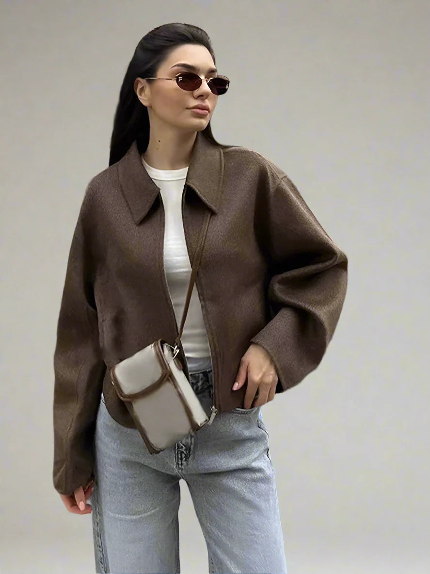 Opgrader din garderobe med denne smukt skræddersyede uldjakke, designet til kvinder, der værdsætter en elegant og ubesværet stil. Med sin sofistikerede revers, strukturerede pasform og stilfulde lynlåslukning er denne korte jakke det perfekte lag til enhver lejlighed. Uanset om du kombinerer den med jeans for et afslappet streetwear-look eller bærer den over en kjole for et mere eksklusivt udtryk, udstråler denne jakke selvtilid og klasse.