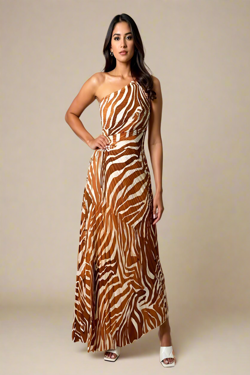 Alva Kjole | Plisseret one-shoulder kjole med zebramønster