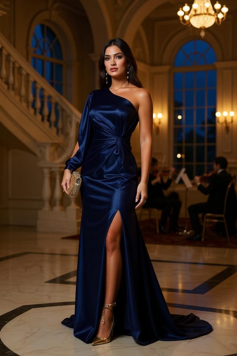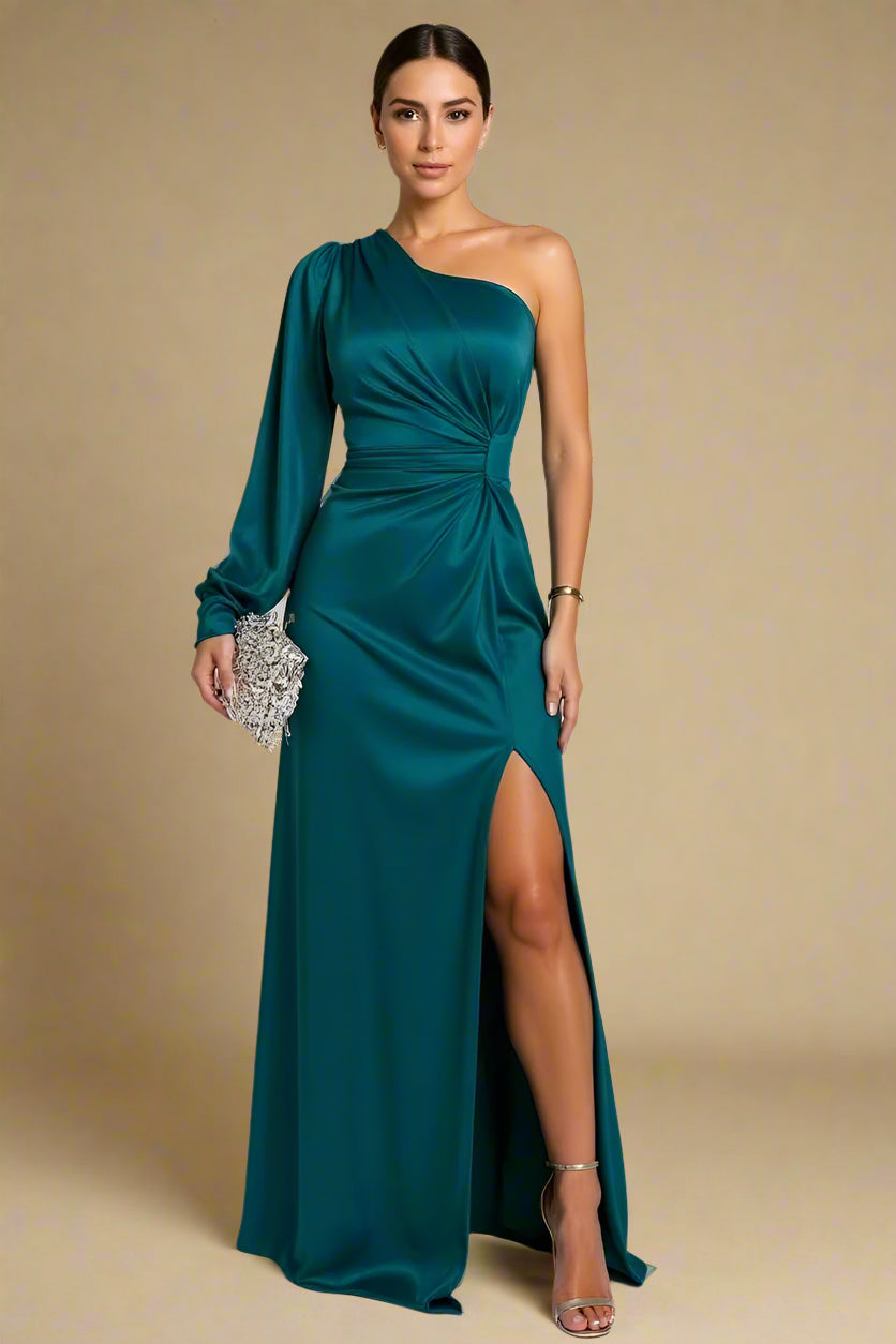 Elira kjolen udstråler raffineret glamour med sit asymmetriske snit og skinnende satinfinish. Den draperede talje fremhæver figuren smukt, mens slidsen og det lange ærme med åbninger tilføjes et strejf af dramatik. Ideel til bryllupper, gallafester eller enhver særlig aften, hvor du vil føle dig uforglemmelig.