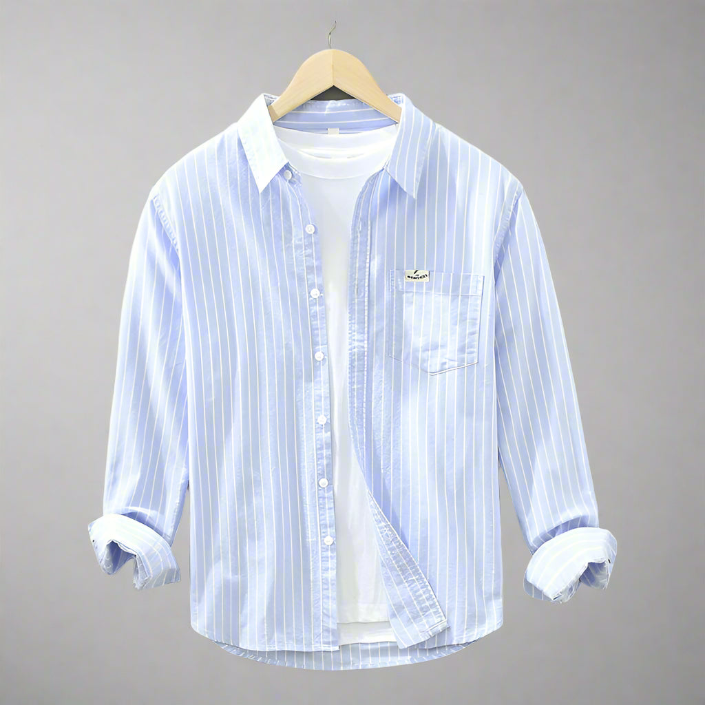 Omfavn kystens elegance med Simon | Strikket skjorte . Denne stribede sweater forener ubesværet stil med afslappet elegance. Fremstillet af førsteklasses hør, holder den dig kølig og komfortabel, samtidig med at den udstråler en afslappet kyststemning. Uanset om du tilbringer en dag på stranden eller tager på en afslappet udflugt, sørger Simon™ for, at du forbliver både elegant og afslappet.